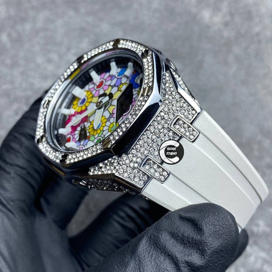 Casioak Mod-klocka Diamantsilverfodral Vit rem Svartvit tidsmarkering Takashi Murakami urtavlor 44mm
